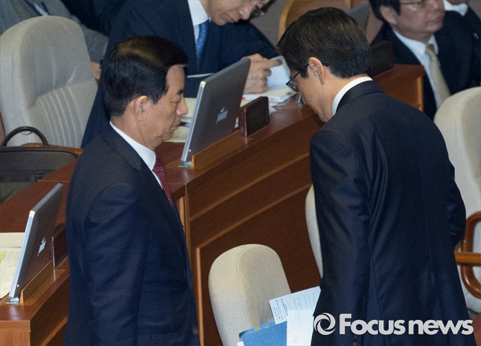 (서울=포커스뉴스) 20일 오전 서울 여의도 국회에서 열린 344회 국회(임시회) 2차 본회의, 사드(THAAD·고고도미사일방어체계) 배치에 대한 긴급현안질문에 참석한 황교안(오른쪽) 국무총리, 한민구 국방부 장관이 각각 자리로 향하고 있다.