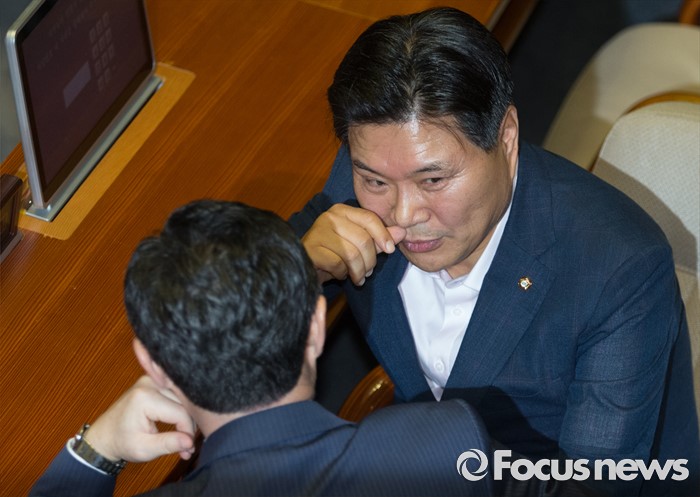 (서울=포커스뉴스) 20일 오전 서울 여의도 국회에서 열린 344회 국회(임시회) 2차 본회의, 사드(THAAD·고고도미사일방어체계) 배치에 대한 긴급현안질문에 참석한 홍문종(오른쪽), 유기준 새누리당 의원이 대화하고 있다.