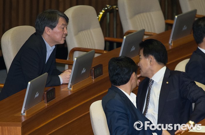 (서울=포커스뉴스) 20일 오전 서울 여의도 국회에서 열린 344회 국회(임시회) 2차 본회의, 사드(THAAD·고고도미사일방어체계) 배치에 대한 긴급현안질문에 참석한 안철수(왼쪽), 정동영 국민의당 의원이 대화하고 있다.