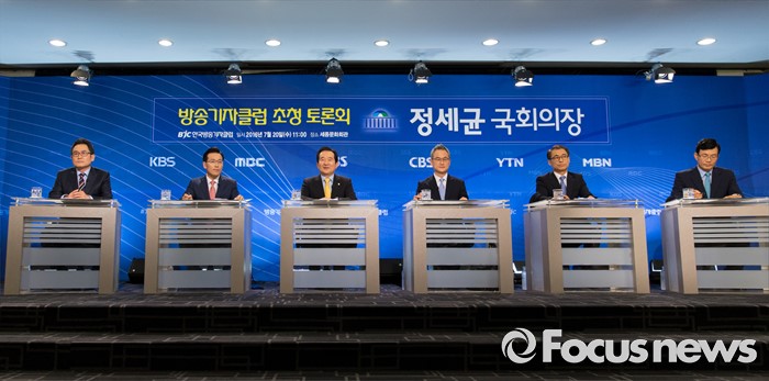 (서울=포커스뉴스) 정세균(왼쪽 세번째) 국회의장이 20일 오전 서울 종로구 세종문화회관에서 열린 한국방송기자클럽 초청 토론회에 참석해 모두발언을 하고 있다.