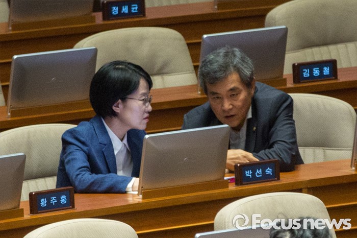 (서울=포커스뉴스) 박선숙(왼쪽) 국민의당 의원과 이상돈 국민의당 의원이 20일 오전 서울 여의도 국회에서 열린 344회 국회(임시회) 2차 본회의, 사드(THAAD, 고고도미사일방어체계) 배치에 대한 긴급현안질문에 참석해 대화 하고 있다.