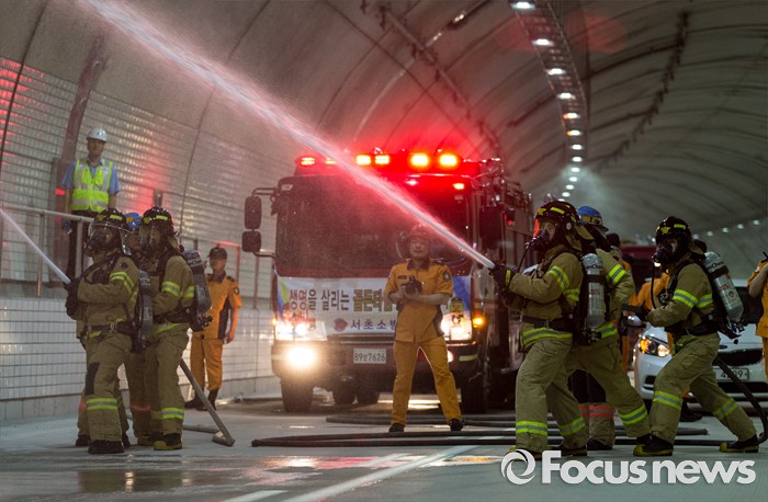 (서울=포커스뉴스) 20일 오후 서울 관악구 봉천터널 내에서 서초소방서, 방배경찰서 대원들이 강남순환도로 화재대응 유관기관 합동훈련을 하고 있다.