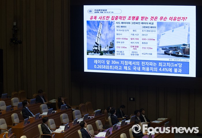 (서울=포커스뉴스) 20일 오후 서울 여의도 국회에서 열린 344회 국회(임시회) 2차 본회의, 사드(THAAD·고고도미사일방어체계) 배치에 대한 긴급현안질문에 참석한 김현아 새누리당 의원이 사드 레이더와 그린파인 레이더 비교표를 보여주며 질문하고 있다.