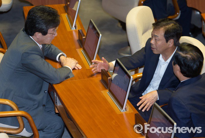 (서울=포커스뉴스) 20일 오후 서울 여의도 국회에서 열린 344회 국회(임시회) 2차 본회의, 사드(THAAD·고고도미사일방어체계) 배치에 대한 긴급현안질문에 참석한 유승민(왼쪽부터), 이완영, 김성찬 새누리당 의원이 대화하고 있다.