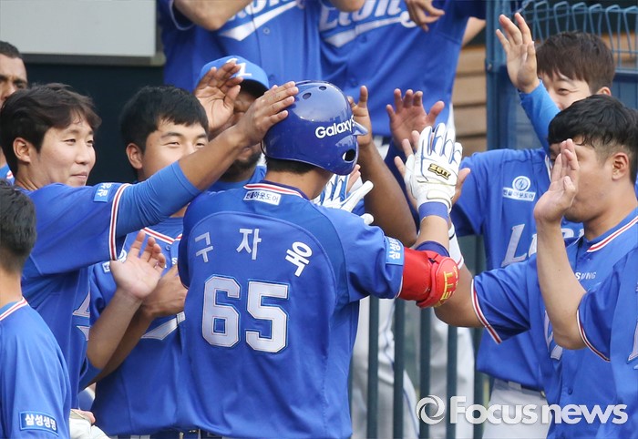 (서울=포커스뉴스) 20일 서울 잠실구장에서 열린 2016 프로야구 삼성-두산 경기 1회초 삼성 선두타자 구자욱이 좌츳 폴대를 맞히는 홈런을 치고 더그아웃에서 동료들의 축하를 받고 있다.