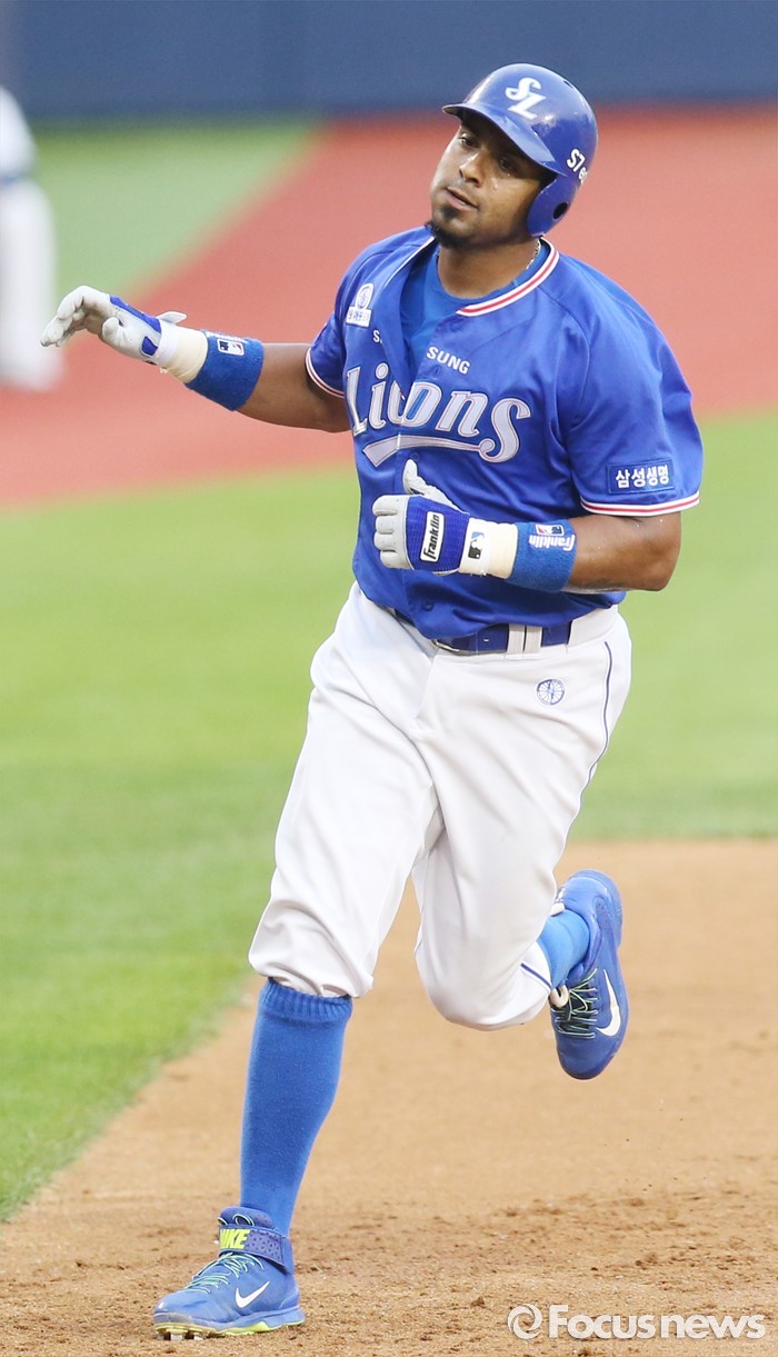 (서울=포커스뉴스) 20일 서울 잠실구장에서 열린 2016 프로야구 삼성-두산 경기 3회초 2사후 삼성 발디리스가 좌월 만루홈런을 치고 3루를 돌아 홈인하고 있다.