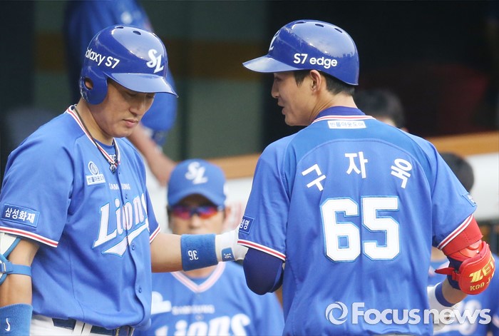 (서울=포커스뉴스) 20일 서울 잠실구장에서 열린 2016 프로야구 삼성-두산 경기 1회초 삼성 선두타자 구자욱이 좌츳 폴대를 맞히는 홈런을 치고 홈인하며 이승엽의 축하를 받고 있다.
