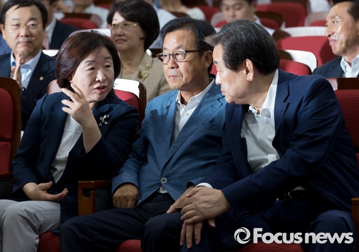 (서울=포커스뉴스) 21일 오전 서울 여의도 국회 의원회관에서 열린 퓨처라이프포럼 2기 출범식 및 세미나에 참석한 김무성(오른쪽부터) 새누리당 전 대표, 원혜영 더불어민주당 의원, 심상정 정의당 상임대표가 대화하고 있다.
