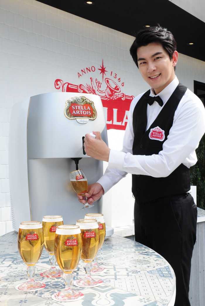 성배 모양의 전용잔인 챌리스(Chalice)에 스텔라만의 9단계에 걸친 음용법을 따라 마시면 최상의 맛과 향을 경험할 수 있다.오비맥주 모델이 '스텔라'의 신개념 생맥주 기기 '노바'를 시연하고 있다.<사진제공=오비맥주>