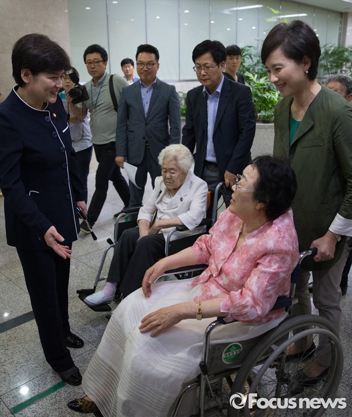(서울=포커스뉴스) 21일 오전 서울 여의도 국회 정론관 앞에서 위안부 특별법 입법 청원 기자회견에 나서는 유은혜 더불어민주당 의원, 최성 고양시장, 이용수, 박옥선, 이옥선 할머니 등과 강은희 여성가족부 장관이 대화하고 있다.