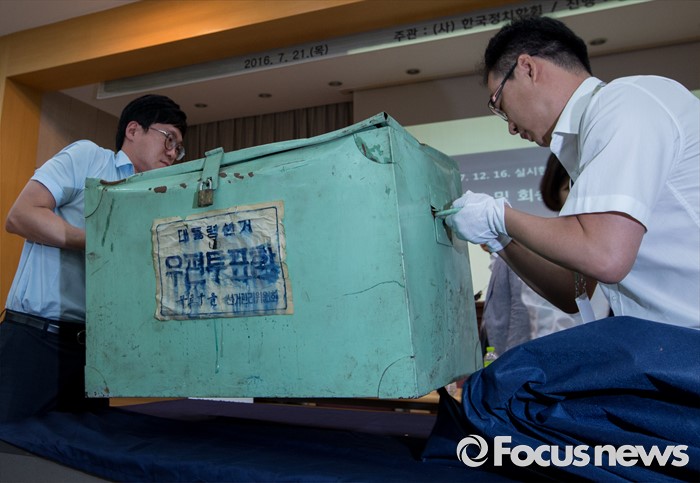 (서울=포커스뉴스) 20일 오전 서울 종로구 선거연수원에서 관계자들이 1987년 제13대 대통령선거 구로구을 우편투표함을 개봉하고 있다.