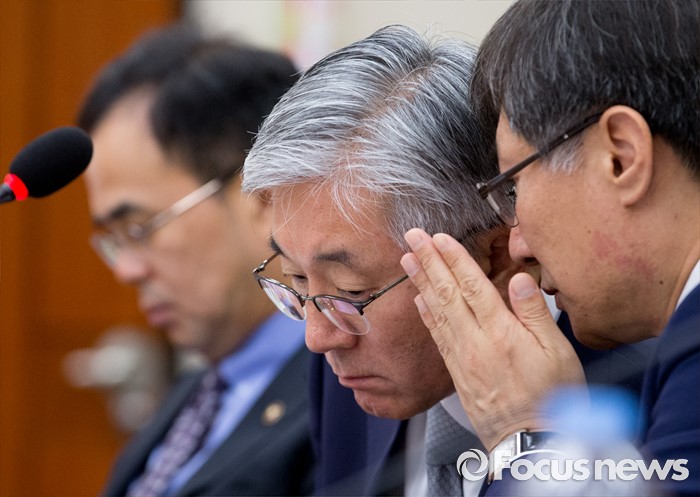 (서울=포커스뉴스) 21일 오전 서울 여의도 국회에서 열린 교육문화체육관광위원회 전체회의에 참석한 김종덕(가운데) 문화체육관광부 장관이 정관주(오른쪽) 1차관과 대화하고 있다.