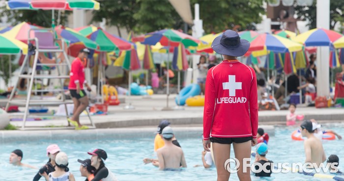 (서울=포커스뉴스) 21일 오후 서울 광진구 뚝섬 한강공원 수영장에 한 안전요원이 시민들을 바라보고 있다.