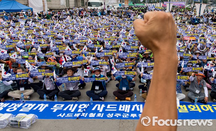(서울=포커스뉴스) 21일 오후 서울역 광장에서 사드 배치 반대를 요구하는 경북 성주군민 2천여 명이 대규모 상경집회를 하고 있다.