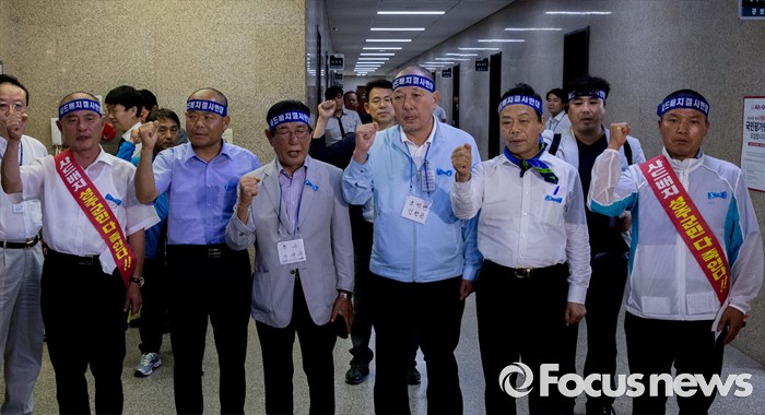 (서울=포커스뉴스) 21일 오후 서울 여의도 국회에서 이완영 새누리당 의원과 김항곤 성주군수 등 성주 사드배치 저지 투쟁위원회 관계자들이 정진석 원내대표 등 지도부와의 면담에 앞서 취재진 앞에 서서 구호를 외치고 있다.