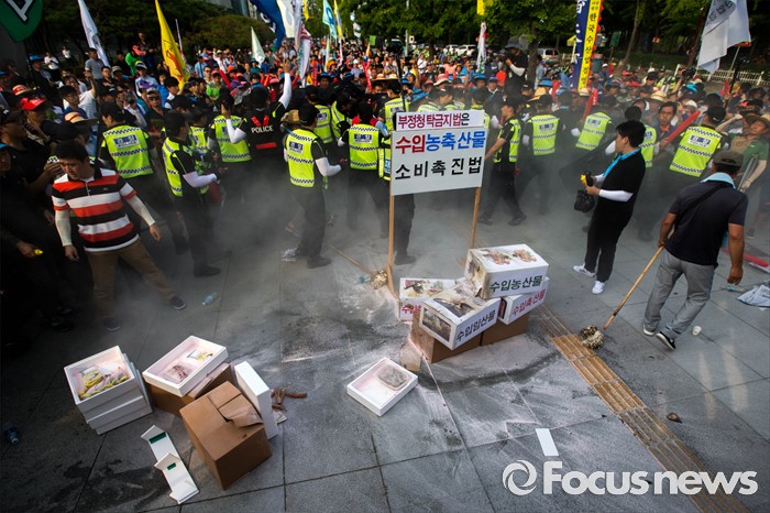 (서울=포커스뉴스) 21일 오후 서울 여의도 산업은행 본점 앞에서 농축산물의 김영란법 적용 제외를 요구하는 전국 농축산인 총궐기대회가 열린 가운데 수입농축산물 모형에 불을 붙이는 퍼포먼스가 진행되고 있다.