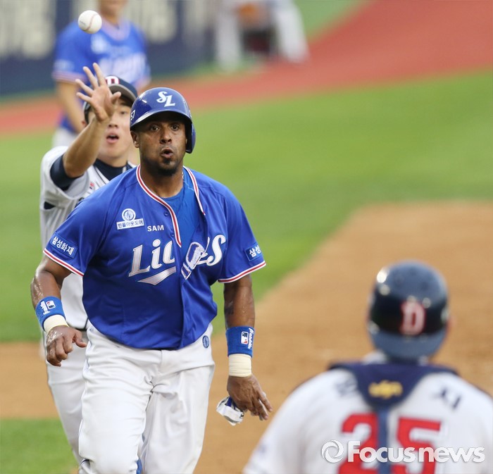 (서울=포커스뉴스) 21일 서울 잠실구장에서 열린 2016 프로야구 삼성-두산 경기 2회초 무사 1,3루에서 두산 허경민이 런다운에 걸린 삼성 3루주자 발디리스를 쫓다 포수 양의지에게 볼을 넘기고 있다.