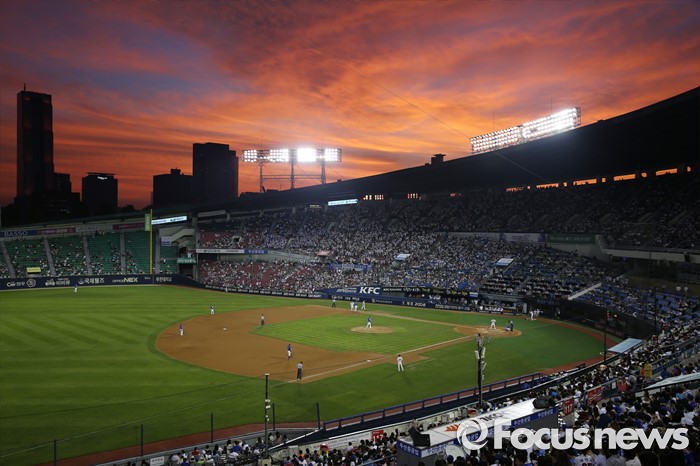 (서울=포커스뉴스) 21일 2016 프로야구 삼성-두산 경기가 열린 서울 잠실구장을 덮은 빨간 노을이 박진감 있는 경기와 더불어 또 하나의 아름다움을 관중들에게 선사하고 있다.