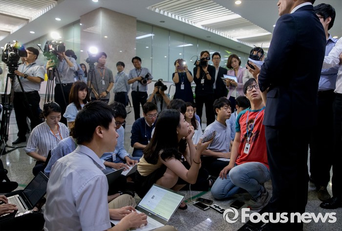 (서울=포커스뉴스) 전당대회 출마를 선언한 정병국 새누리당 의원이 22일 오전 서울 여의도 국회 정론관에서 우병우 청와대 민정수석 사퇴 촉구 및 야당 사드배치 반대 주장 중단 등 현안 관련 기자회견을 마친 뒤 취재진 질문에 답하고 있다.