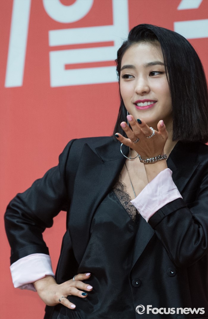 (서울=포커스뉴스) 22일 오후 서울 영등포구 63스퀘어에서 열린 Mnet '힛 더 스테이지' 제작발표회에 참석한 가수 보라가 포토타임을 갖고 있다,