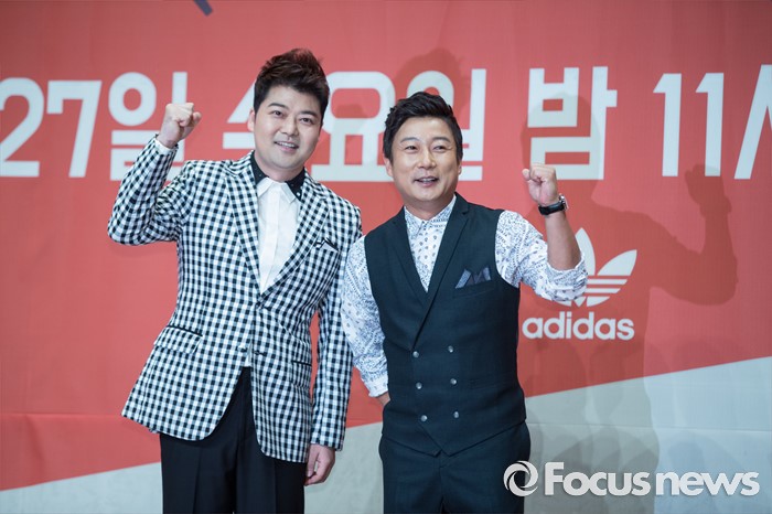 (서울=포커스뉴스) 22일 오후 서울 영등포구 63스퀘어에서 열린 Mnet '힛 더 스테이지' 제작발표회에 참석한 방송인 전현무(왼쪽)와 이수근이 포토타임을 갖고 있다,