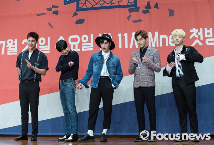 (서울=포커스뉴스) 22일 오후 서울 영등포구 63스퀘어에서 열린 Mnet '힛 더 스테이지' 제작발표회에 참석한 가수 셔누(왼쪽부터) 태민, 텐, 호야, 유권이 포토타임을 갖고 있다,