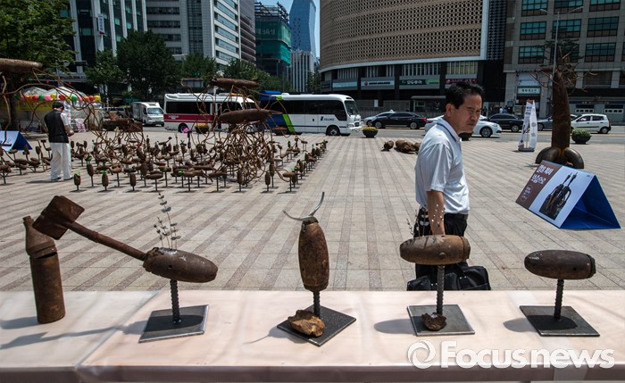 (서울=포커스뉴스) 22일 오후 서울 중구 서울광장에서 '전쟁 없는 세상을 위한 에이이브이(Art's Eye View) 프로젝트 전시가 열리고 있다. 미공군의 사격장으로 쓰였던 경기도 매향리에서 반출된 포탄 및 탄피를 활용, 1000여점의 예술작품으로 만든 이번 전시는 오는 24일까지 열릴 예정이다.