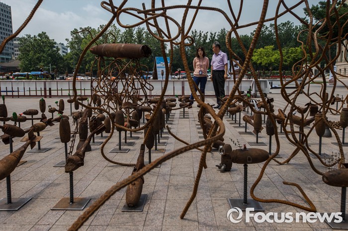 (서울=포커스뉴스) 22일 오후 서울 중구 서울광장에서 '전쟁 없는 세상을 위한 에이이브이(Art's Eye View) 프로젝트 전시가 열리고 있다. 미공군의 사격장으로 쓰였던 경기도 매향리에서 반출된 포탄 및 탄피를 활용, 1000여점의 예술작품으로 만든 이번 전시는 오는 24일까지 열릴 예정이다.