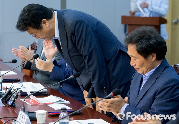 (서울=포커스뉴스) 22일 오후 서울 여의도 국회 의원회관에서 열린 '격차해소를 위한 해법, 왜 중향평준화인가?' 세미나에 참석한 정진석 새누리당 원내대표가 인사하고 있다.