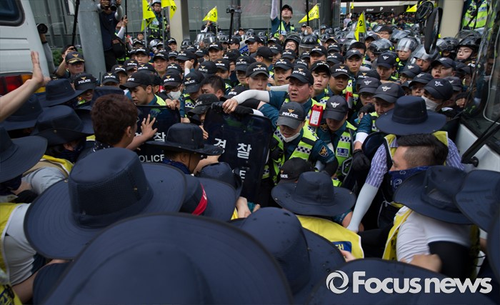 (서울=포커스뉴스) 금속노조 삼성전자서비스지회 조합원들이 22일 오후 서울 서초구 삼성 서초사옥 앞에서 열린 '재벌개혁 투쟁 결의대회'에 참석해 수리기사 추락사에 따른 안전대책 마련을 위한 대원청 요구안을 전달하기 위해 이동하던 중 경찰과 충돌하고 있다.