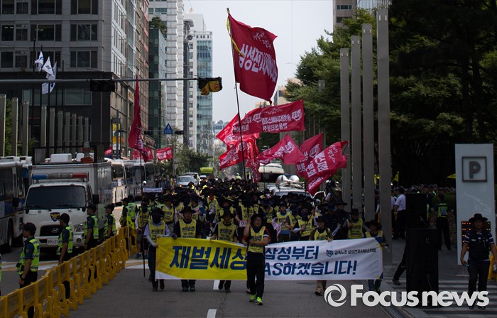 (서울=포커스뉴스) 금속노조 삼성전자서비스지회 조합원들이 22일 오후 서울 서초구 삼성 서초사옥 앞에서 삼성가 3대 세습을 비판하며 거리행진 하고 있다.