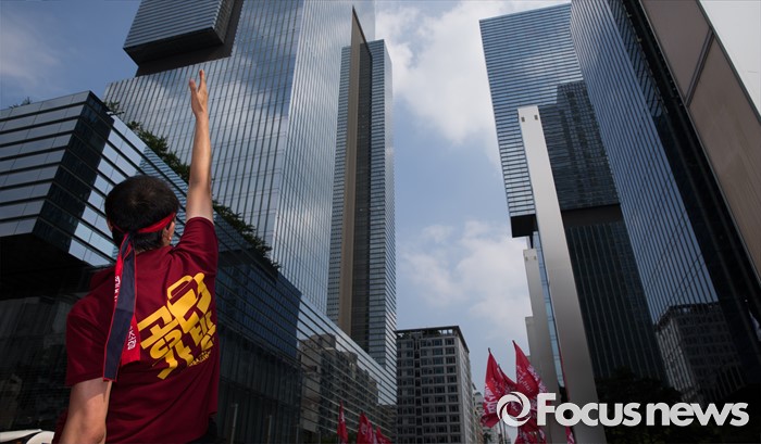 (서울=포커스뉴스) 금속노조 삼성전자서비스지회 조합원들이 22일 오후 서울 서초구 삼성 서초사옥 앞에서 열린 '재벌개혁 투쟁 결의대회'에 참석해 삼성가 3대 세습을 비판하는 구호를 외치고 있다.