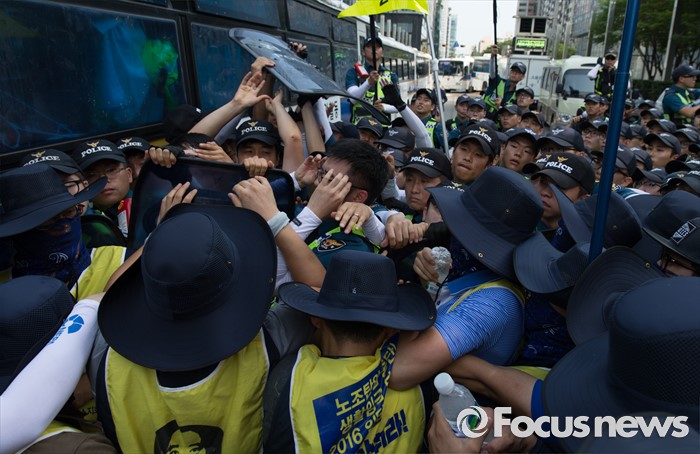 (서울=포커스뉴스) 금속노조 삼성전자서비스지회 조합원들이 22일 오후 서울 서초구 삼성 서초사옥 앞에서 열린 '재벌개혁 투쟁 결의대회'에 참석해 수리기사 추락사에 따른 안전대책 마련을 위한 대원청 요구안을 전달하기 위해 이동하던 중 경찰과 충돌하고 있다.