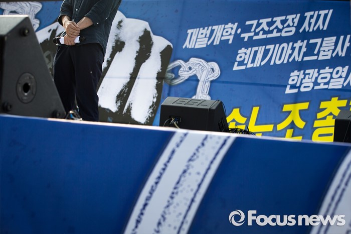 (서울=포커스뉴스) 정부의 일방적인 조선업 구조조정 중단과 현대차 그룹의 성실한 그룹사 공동교섭 참여, 정부의 노동개악 철회등을 내걸며 파업에 들어간 전국금속노조가 22일 오후 서울 서초구 현대자동차 본사 앞에서 금속노조 총파업 대회를 열고 있다.