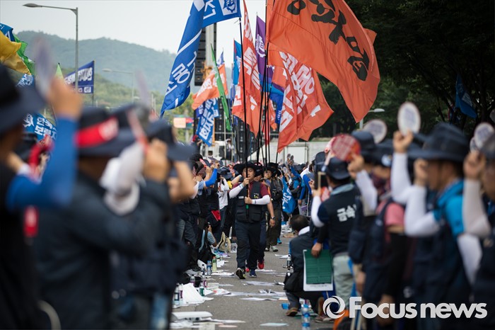(서울=포커스뉴스) 정부의 일방적인 조선업 구조조정 중단과 현대차 그룹의 성실한 그룹사 공동교섭 참여, 정부의 노동개악 철회등을 내걸며 파업에 들어간 전국금속노조가 22일 오후 서울 서초구 현대자동차 본사 앞에서 금속노조 총파업 대회를 열고 있다.