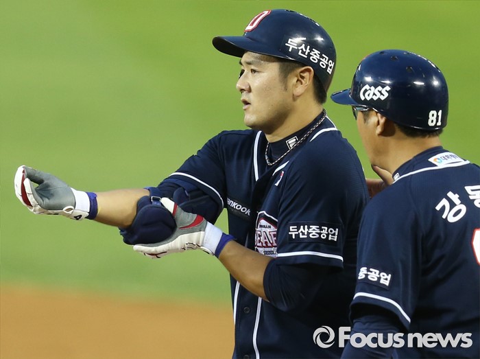 (서울=포커스뉴스) 22일 서울 잠실구장에서 열린 2016 프로야구 두산-LG 경기 4회초 1사 3루에서 두산 최주환이 좌익수 왼쪽에 떨어지는 안타로 타점을 올리고 1루에서 주루코치의 사인을 보고 있다.