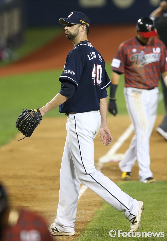 (서울=포커스뉴스) 22일 서울 잠실구장에서 열린 2016 프로야구 두산-LG 경기 6회말 주자 만루의 실점 위기를 넘긴 두산 투수 니퍼트가 더그아웃으로 향하고 있다.