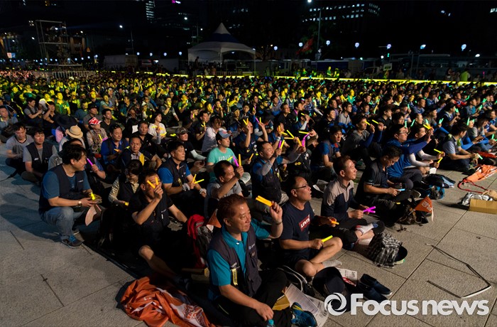 (서울=포커스뉴스) 22일 오후 서울 광화문광장에서 열린 2016 재벌개혁 시민한마당에서 전국금속노동조합(금속노조)이 율동공연을 보며 야광봉을 흔들고 있다.