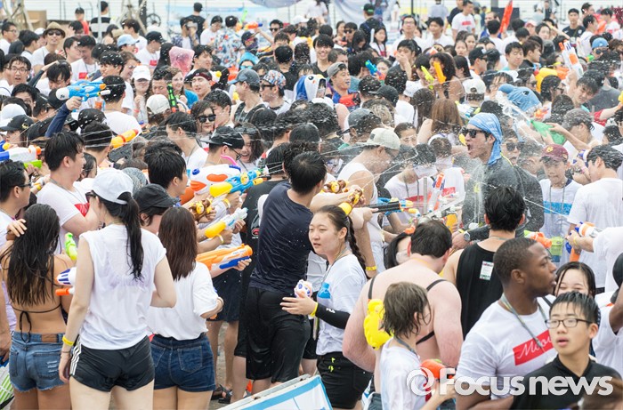 (서울=포커스뉴스) 23일 오후 서울 여의도 한강공원에서 열린 한강 물싸움 축제에서 참가자들이 시원한 물총싸움을 하며 더위를 식히고 있다.