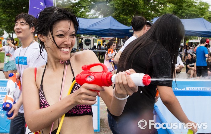 (서울=포커스뉴스) 23일 오후 서울 여의도 한강공원에서 열린 한강 물싸움 축제에서 참가자들이 시원한 물총싸움을 하며 더위를 식히고 있다.
