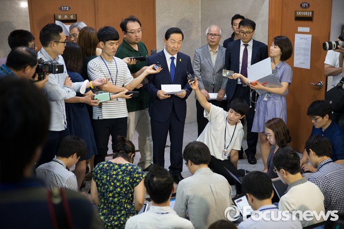 (서울=포커스뉴스) 김상곤 전 더불어민주당 혁신위원장이 24일 오전 서울 여의도 국회 정론관에서 당대표 출마 기자회견을 마친 뒤 취재진의 질문에 답하고 있다.