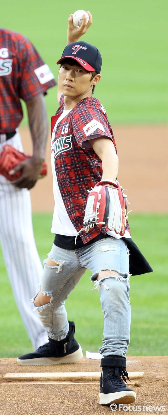(서울=포커스뉴스) 24일 서울 잠실구장에서 열린 2016 프로야구 두산-LG 경기에 앞서 가수 장우혁이 시구하고 있다.