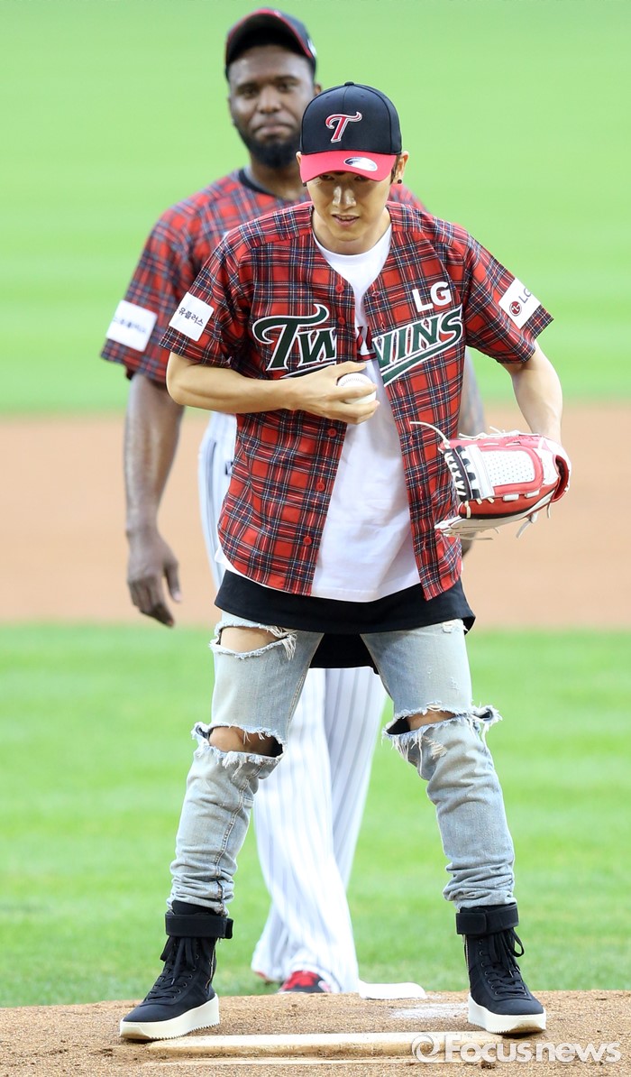 (서울=포커스뉴스) 24일 서울 잠실구장에서 열린 2016 프로야구 두산-LG 경기에 앞서 시구자롤 나온 가수 장우혁이 포수를 보며 세리머니를 하고 있다.