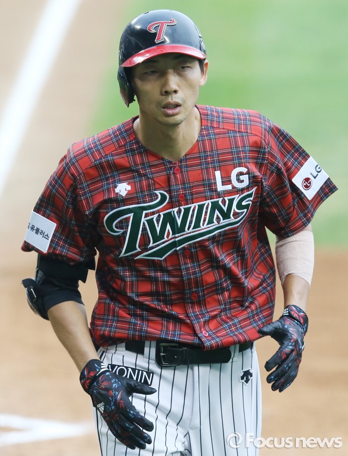 (서울=포커스뉴스) 24일 서울 잠실구장에서 열린 2016 프로야구 두산-LG 경기 1회말 LG 김용의가 1번타자로 나온 첫 경기 첫 타석에서 좌월 선제 솔로 홈런을 치고 의기양양하게 홈인하고 있다.