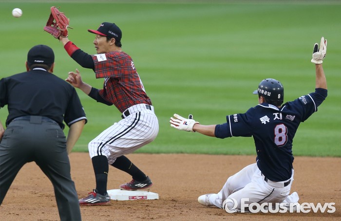 (서울=포커스뉴스) 24일 서울 잠실구장에서 열린 2016 프로야구 두산-LG 경기 3회초 중전 안타로 진루한 두산 류지혁이 박건우의 유격수앞 땅볼때 2루에서 포스아웃되고 있다.