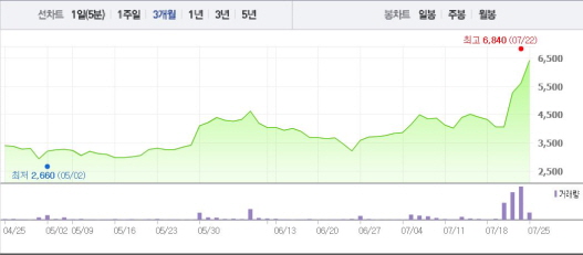 에임하이는 25일 오전 9시38분 현재 전 거래일 대비 14.06%(790원) 상승한 6410원에 거래되고 있다. 에임하이는 21일과 22일에도 29.89%, 6.44%의 상승폭을 기록했다.