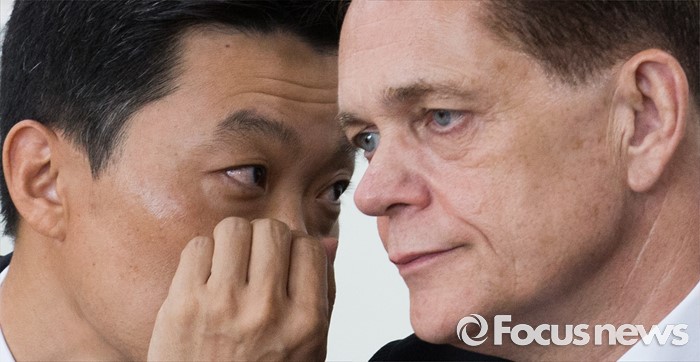(인천=포커스뉴스) 요하네스 타머(오른쪽) 아우디폭스바겐 사장과 정재균 부사장이 25일 오전 인천 서구 국립환경과학원에서 열린 차량 인증 조작 관련 환경부 청문회에 참석해 대화 나누고 있다.
