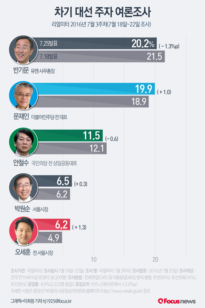 (서울=포커스뉴스) 25일 발표한 여론조사 기관 리얼미터 2016년 7월 3주차 주간집계에 따르면 차기 대선 주자 여론조사에서 반기문 유엔사무총장이 3주 연속 하락세를 보이며 문재인 더불어민주당 전 대표와 선두 접전을 벌이고 있는 것으로 조사됐다.