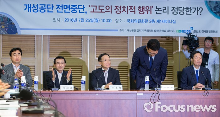 (서울=포커스뉴스) 25일 오전 서울 여의도 국회 의원회관에서 개성공단살리기 국회의원 모임 주최로 열린 개성공단 전면중단, 고도의 정치적 행위 논리 정당한가? 세미나에 전당대회 출마를 선언한 송영길(오른쪽 두번째) 더불어민주당 의원이 인사하고 있다.