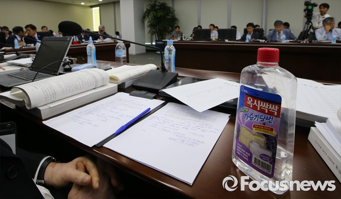 (세종=포커스뉴스) 25일 오전 세종시 정부세종청사 국회회의실에서 열린 환경부·고용노동부·국립환경과학원·안전보건공단에 대한 국회 가습기살균제 특조위 현장조사에서 옥시싹싹 제품이 보이고 있다.